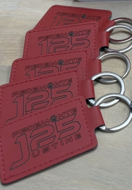 Soutenez Justine en achetant ce petit porte-clé en simili cuir gravé